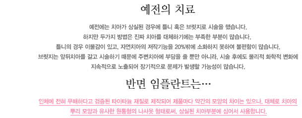 하지만 두가지 방법은 진짜 치아를 대체하기에는 부족한 부분이 많습니다. 틀니의 경우 이물감이 있고, 자연치아의 저작기능을 20%밖에 소화하지 못하여 불편함이 많습니다.